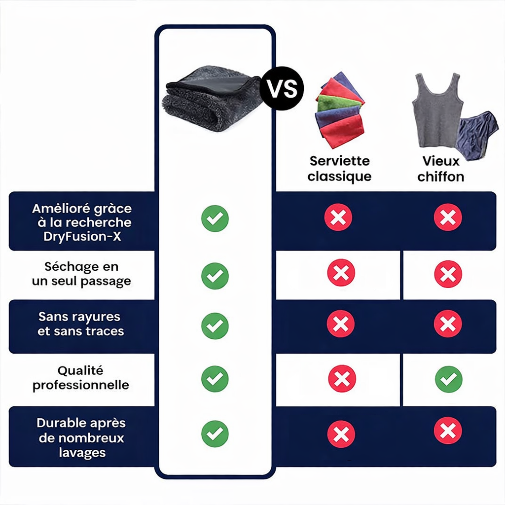 Absolument ! Grâce à la technologie DryFusion-X™, vous pouvez sécher l'intégralité de votre véhicule en une seule fois sans jamais avoir besoin de l'essorer.
